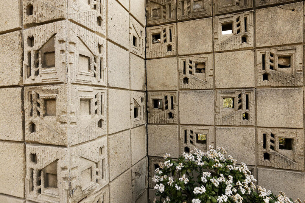 ブロックには装飾的な模様が刻まれており、それらが繰り返し並ぶことで建築の表情をつくり出します。そしてブロック同士は鉄筋で連結され、まるで布を織るように組み上げられることから、ライトはこれを「テキスタイル(織物)ブロック」と呼びました。