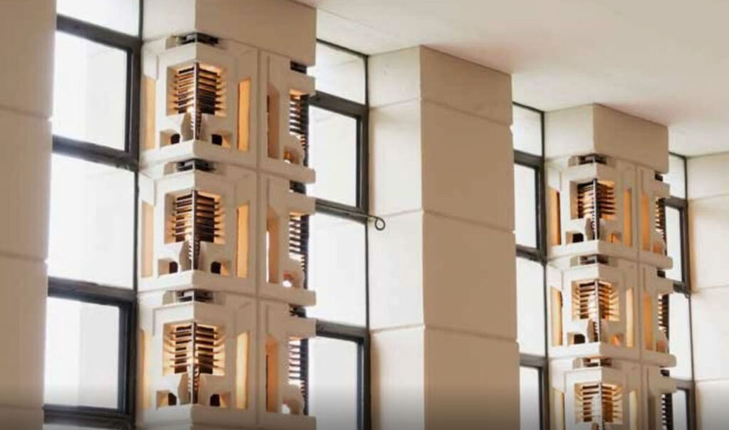 ここで重要なのは、ライトが単なる装飾としてではなく、光の制御装置としてブロックを使っている点です。装飾を機能の一部に取り込んでいく手法は、ライトの設計の基本的な姿勢です。
