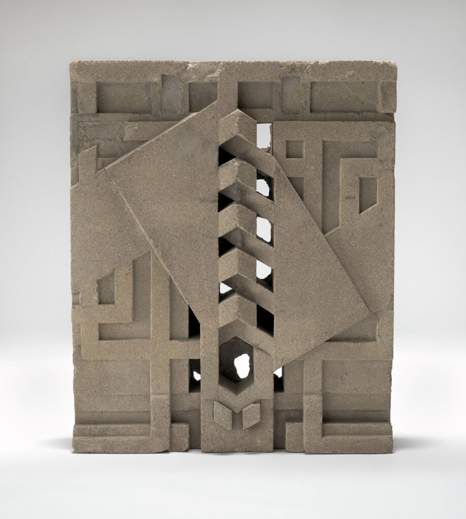 ミッドウェイ・ガーデンでは、外壁に黄色いレンガ(イエロー・ブリック)が用いられていました。そして、その壁面にアクセントとして配置されたのが、複雑な幾何学模様を持つコンクリート製の装飾パネルでした。